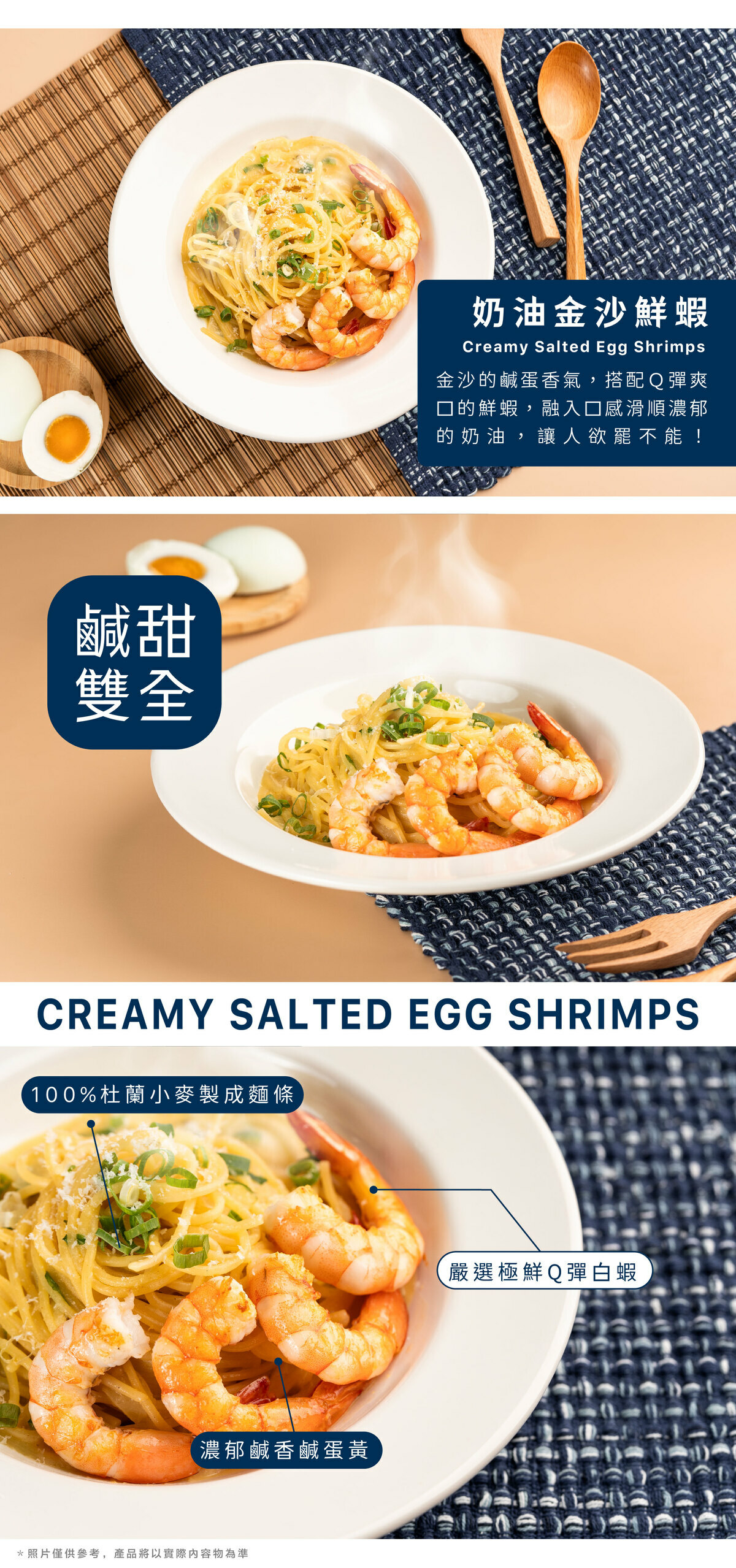 金沙的鹹蛋香氣,搭配Q彈爽口的鮮蝦,融入口感滑順濃郁的奶油,馥郁香氣讓人欲罷不能!