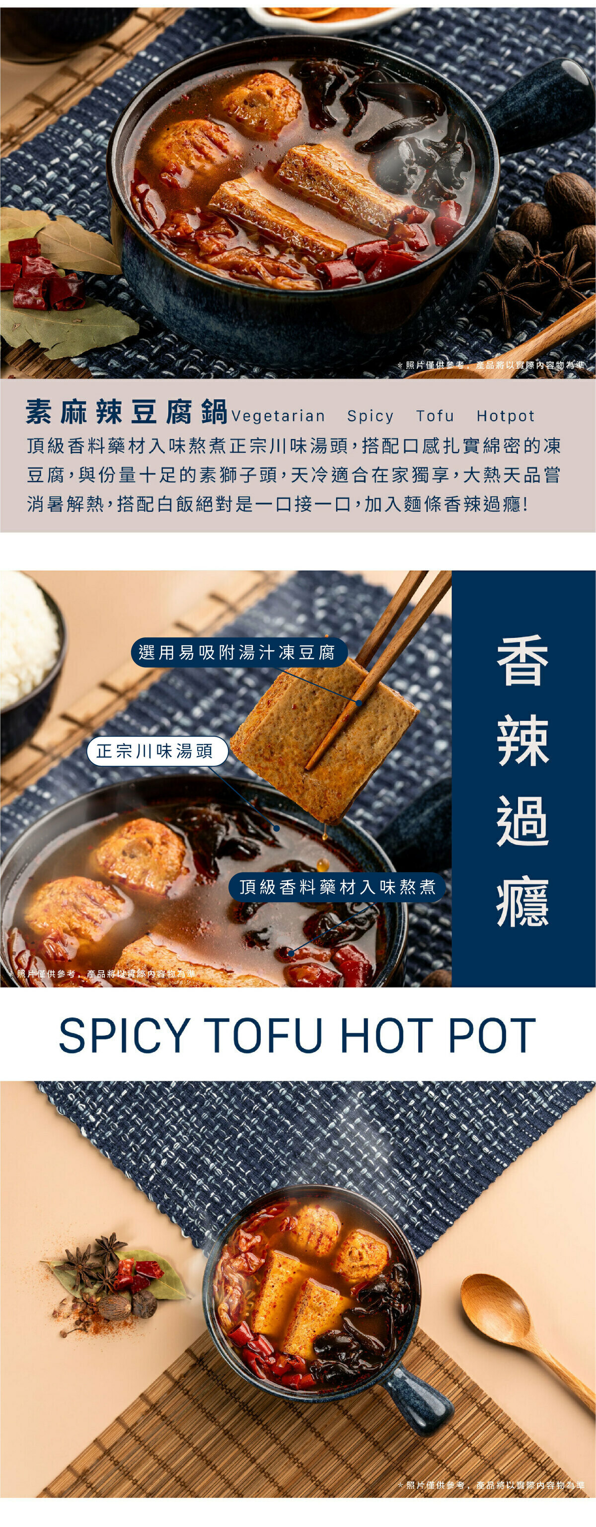 頂級香料藥材入味熬煮正宗川味湯頭,搭配口感扎實綿密的凍豆腐,與份量十足的素獅子頭,天冷適合在家獨享,大熱天品嘗消暑解熱,搭配白飯絕對是一口接一口,加入麵條香辣過癮!