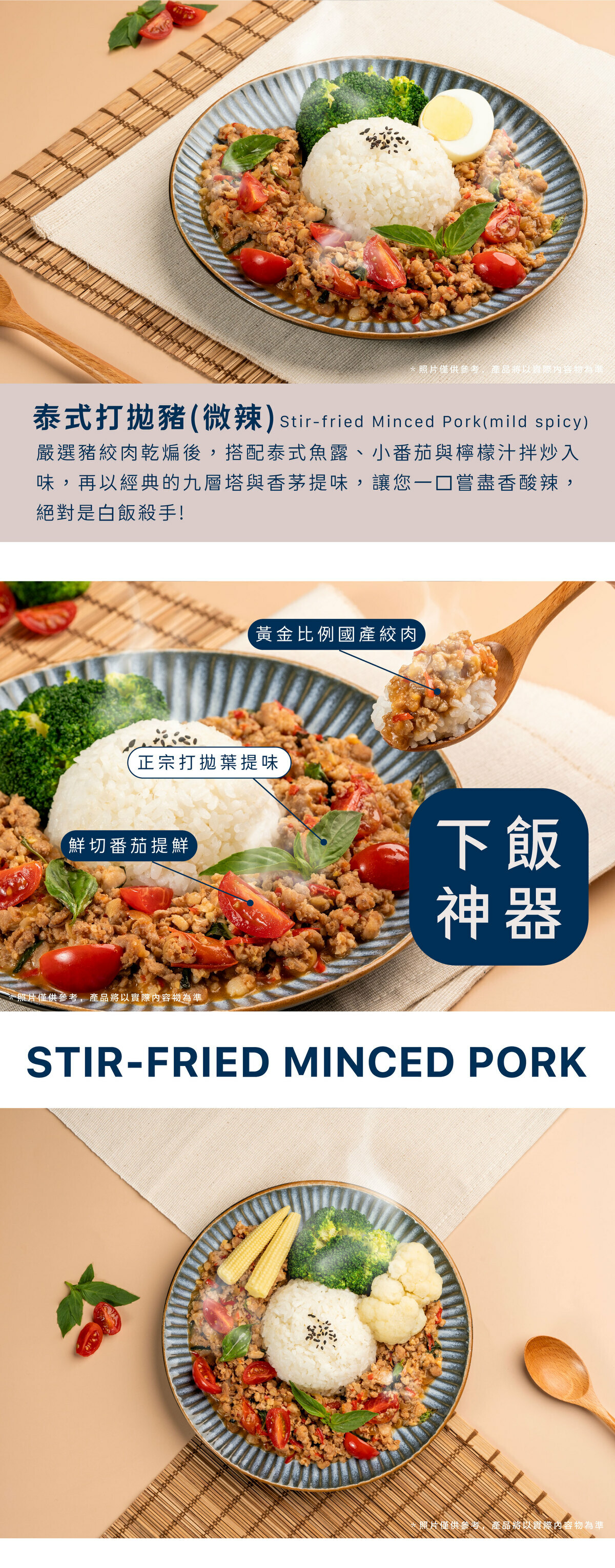 嚴選豬絞肉乾煸後,搭配泰式魚露、小番茄與檸檬汁拌炒入味,再以經典的九層塔與香茅提味,讓您一口嘗盡香酸辣,絕對是白飯殺手!