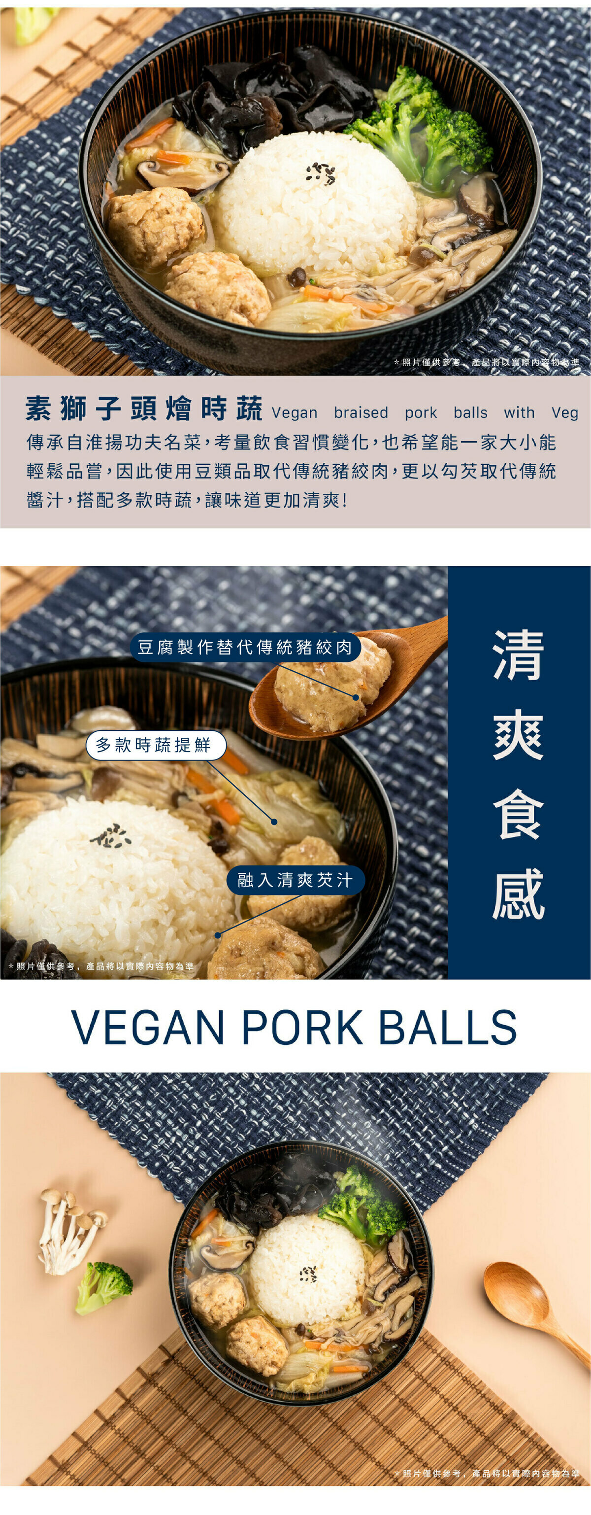 傳承自淮揚功夫名菜,考量飲食習慣變化,也希望能一家大小能輕鬆品嘗,因此使用豆類品取代傳統豬絞肉,更以勾芡取代傳統醬汁,搭配多款時蔬,讓味道更加清爽!